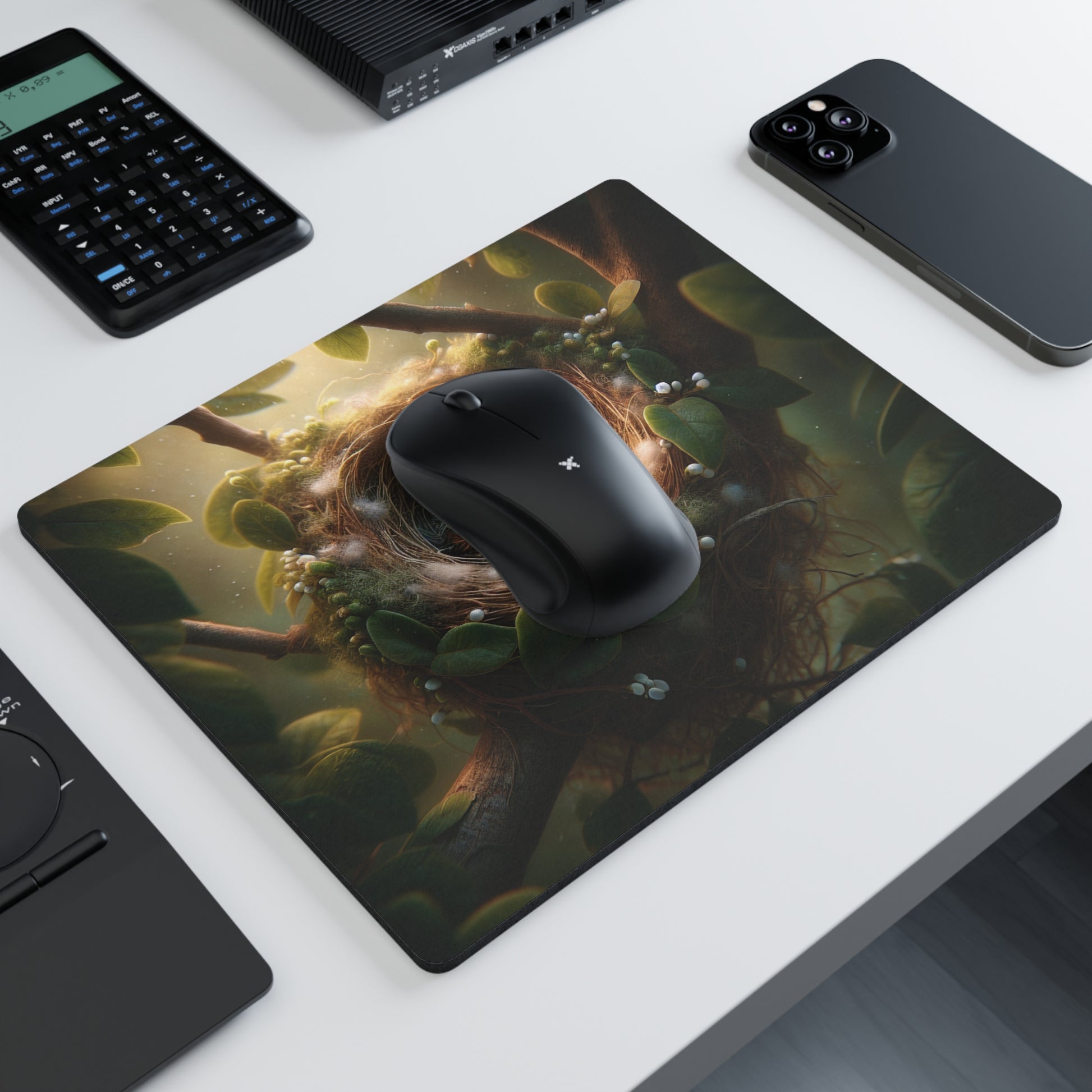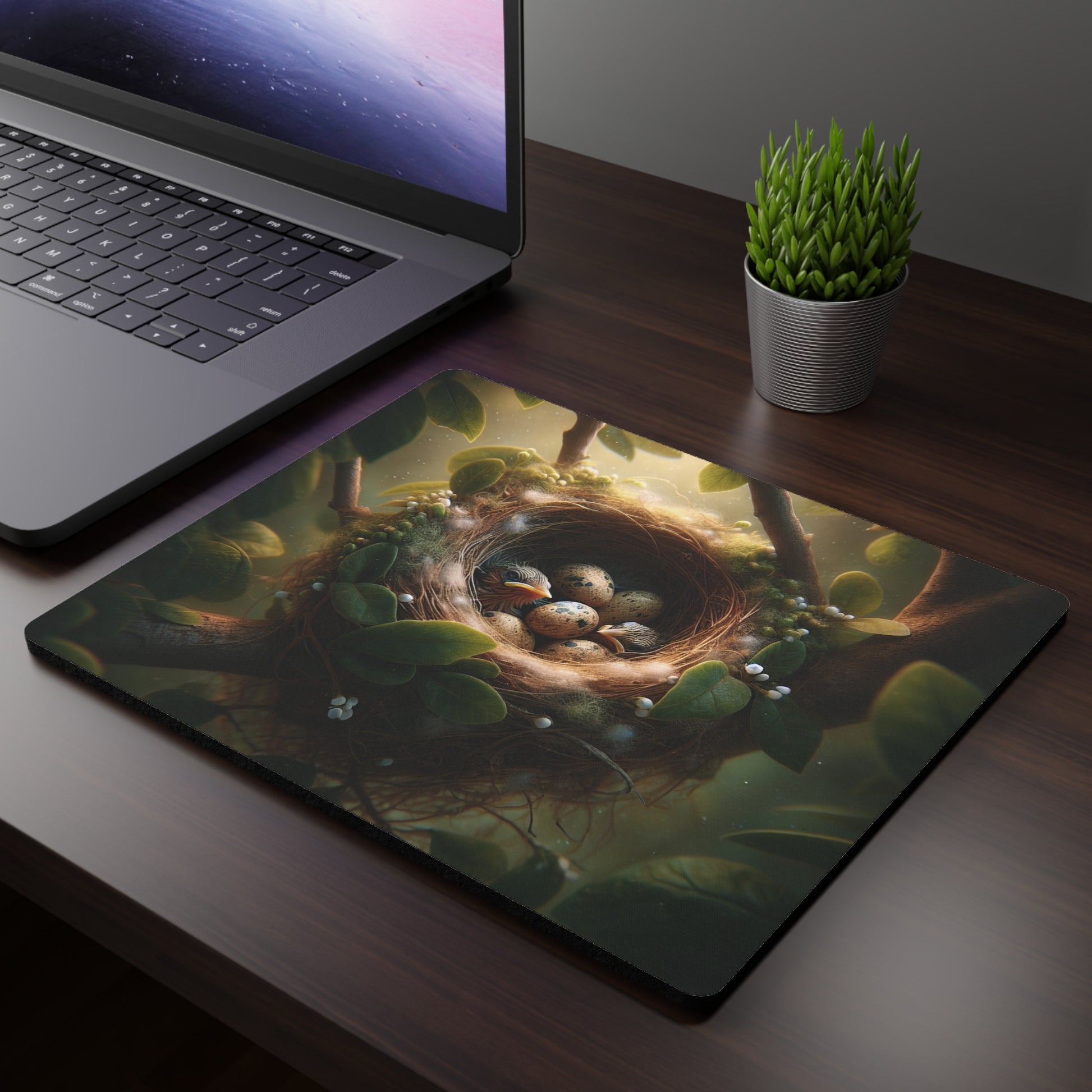 A custom rectangular mouse pad featuring a vibrant image of a bird's nest, perfect for a new dad. This mouse pad provides a smooth and even surface for improved mouse tracking, making it ideal for those who enjoy personalizing their workspace. Great for Father's Day gifts, baby showers, or any new dad celebration.